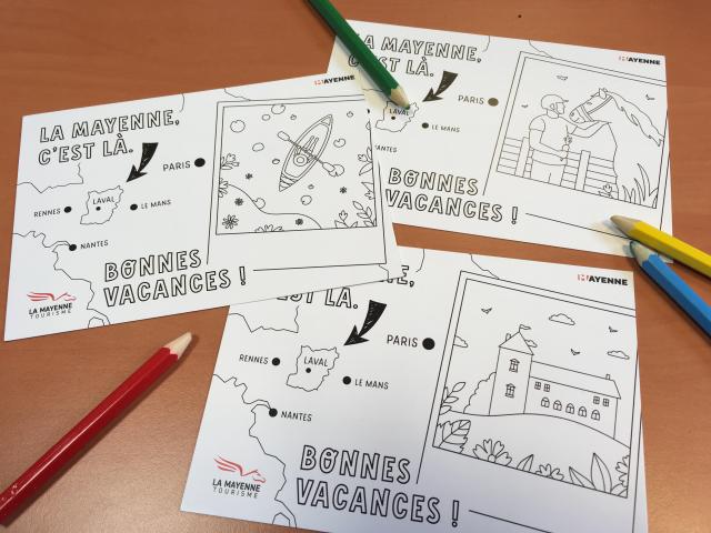 Because all those lovely memories of vacations in Mayenne deserve to be told to friends and family, you can collect our free coloring postcards from Tourist Offices throughout the department.