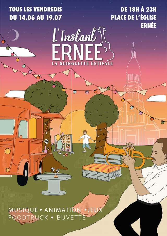 L'instant'Ernée Guinguette estivaleÀ partir du 14 juin et jusqu’au 19 juillet 2024, la guinguette estivale L’Instant Ernée reprend sa place en centre-ville, tous les vendredis de 18h à 23h.